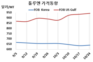 톨루엔 시세는 10월24일 FOB Korea가 톤당 640달러, CFR SE Asia는 700달러로 각각 5달러 상승했다. CFR China는 650달러로 5달러, CFR India는 750달러로 15달러 올랐다.