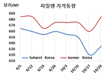 용제(Solvent) 그레이드 M-X 시세는 10월24일 FOB Korea가 톤당 635달러, CFR SE Asia는 705달러로 각각 15달러 상승했다. CFR China는 685달러, CFR India는 745달러로 각각 15달러 올랐다.