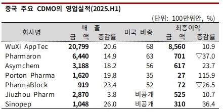 중국 CDMO 메이저들은 2024년 경기 둔화와 미국의 생물보안법(Biosecure Act) 우려로 해외 수요기업이 이탈하면서 영업실적이 크게 악화됐으나 2025년 상반기 들어 대체로 회복하고 있다.
