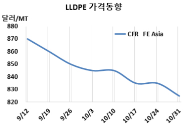 LLDPE 시세는 10월29일 CFR FE Asia가 톤당 825달러, CFR SE Asia는 870달러로 각각 10달러 하락했다. CFR India도 860달러로 10달러 하락했다. 유럽은 10월31일 FD NWE 880유로로 변동이 없었다.