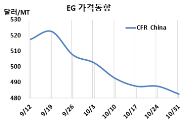 LDPE 시세는 MEG 시세는 10월31일 CFR China가 톤당 483달러, CFR SE Asia는 493달러로 각각 5달러 하락했다.