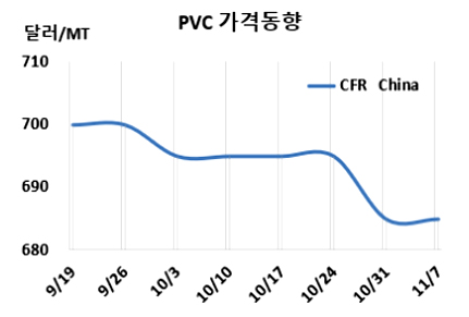 PVC 시세는 11월5일 CFR China가 톤당 685달러, CFR SE Asia는 640달러로 변동이 없었다. CFR India도 700달러로 보합세를 유지했다. 유럽은 11월7일 FD NWE가 815유로로 15유로 하락했고, 미국 FAS Houston 560달러로 변동이 없었다. 표, 그래프: <PVC 가격동향> |
