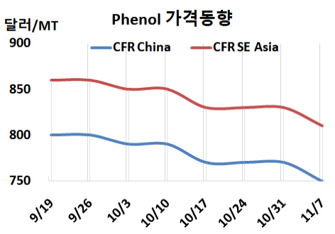 화학뉴스 2025.11.12 페놀(Phenol)은 하락했다.