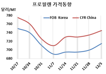 프로필렌 시세는 12월5일 FOB Korea가 톤당 715달러로 15달러 상승한 반면, CFR SE Asia는 770달러로 10달러 하락했다. 중화권은 CFR China가 745달러, CFR Taiwan은 745달러로 각각 10달러 올랐다.