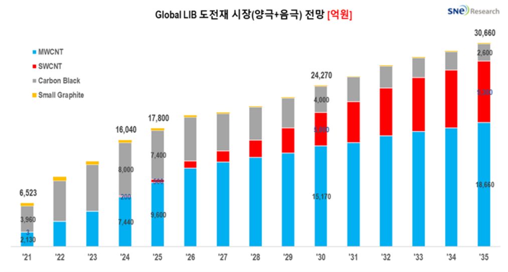 글로벌 배터리 도전재 시장은 2021년부터 11.7%씩 성장해 2035년에는 3조700억원에 달할 것으로 예상된다. |