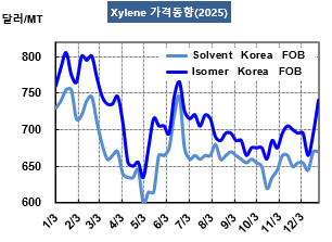 결국 2025년 M-X 시장은 4월의 관세 쇼크와 하반기의 변동성을 딛고, 용제는 계절적 수요, 아이소머는 P-X 강세라는 양날개로 비상하며 드라마틱한 생존기를 썼다. 올해 시장은 극심한 등락 속에서도 공급 조절이 가격 방어의 핵심 요인으로 작용했다. 내년 1분기에도 역내 주요 설비의 정기보수 영향으로 공급 부족 현상은 당분간 지속될 전망이며, 향후 시세가 700달러 선을 넘어 안정적으로 유지될지는, 설 연휴를 앞두고 중국 수요처들이 얼마나 적극적으로 물량 확보에 나서느냐에 달린 것으로 보인다.