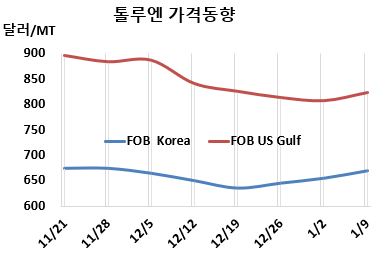 화학뉴스 2026.01.15 톨루엔(Toluene)은 상승했다. 표, 그래프: <Toluene 가격동향> |