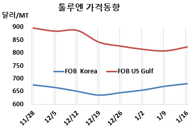 톨루엔 시세는 1월16일 FOB Korea가 톤당 680달러로 10달러 상승한 가운데, CFR SE Asia는 730달러로 변동이 없었다. CFR China는 675달러로 역시 보합세에 그쳤고, CFR India는 780달러로 5달러 올랐다.