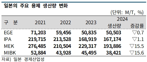 특히, 전체 MEK 수입이 2022-2023년 8만톤대로 감소한 것은 일본 2사의 정기보수 일정에 영향을 받은 것으로 알려졌다.