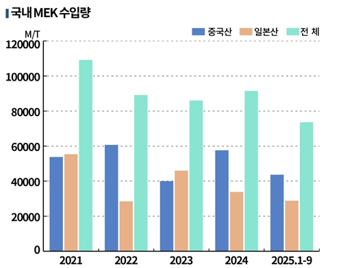 국내 MEK 수입량은 2020년 10만2219톤, 2021년 10만9166톤, 2022년 8만9131톤, 2023년 8만6017톤, 2024년 9만1458톤, 2025년 9만3862톤으로 중국산과 일본산이 대부분을 차지하고 있다.