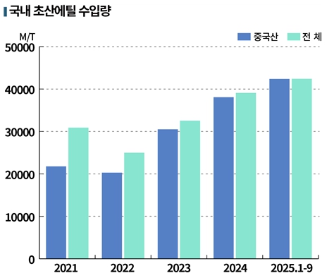 중국산 수입량은 2020년 6만127톤, 2021년 5만3770톤, 2022년 6만666톤, 2023년 4만6톤, 2024년 5만7602톤, 2025년 5만7294톤을 기록했다.