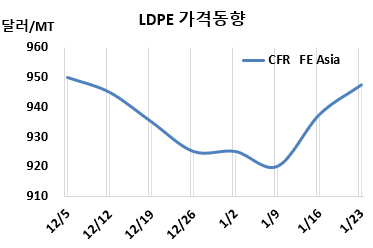 LDPE 시세는 1월21일 CFR FE Asia가 톤당 948달러로 10달러, CFR SE Asia는 1000달러로 5달러 상승했다. CFR India는 1040달러로 10달러 올랐다. 유럽은 1월23일 FD NWE 1100유로로 변동이 없었다.