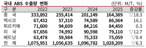 화학뉴스 2026.02.05 2025년 국내 ABS(Acrylonitrile Butadiene Styrene) 수출은 소폭 감소한 것으로 집계됐다.