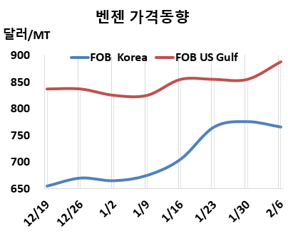화학뉴스 2026.02.11 벤젠(Benzene)은 하락했다. 표, 그래프: <Benzene 가격동향> |