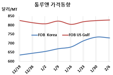 톨루엔 시세는 2월6일 FOB Korea가 톤당 730달러, CFR SE Asia는 775달러로 각각 5달러 하락했다. CFR China는 710달러, CFR India는 830달러로 역시 각각 5달러 떨어졌다.