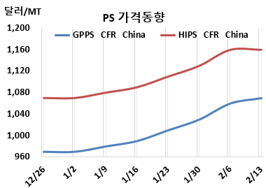 GPPS(General Purpose PS) 시세는 2월11일 CFR China가 1070달러, CFR SE Asia는 1085달러로 각각 10달러 상승했다. CFR India는 1080달러로 20달러 올랐다.