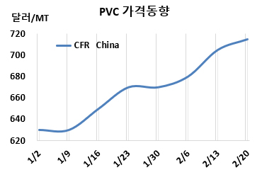 PVC 시세는 2월18일 CFR China가 톤당 715달러로 10달러 상승한 반면, CFR SE Asia는 720달러로 보합세에 그치며 최근 강세가 주춤했다. CFR India는 735달러로 10달러 올랐지만, 유럽은 2월20일 FD NWE가 770유로로 5유로 하락했다.