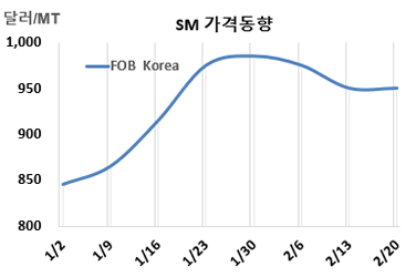SM 시세는 2월20일 FOB Korea가 톤당 950달러, CFR SE Asia는 970달러로 변동이 없었다. CFR China는 945달러, CFR Taiwan은 960달러, CFR India는 1005달러로 역시 보합세에 그쳤다.