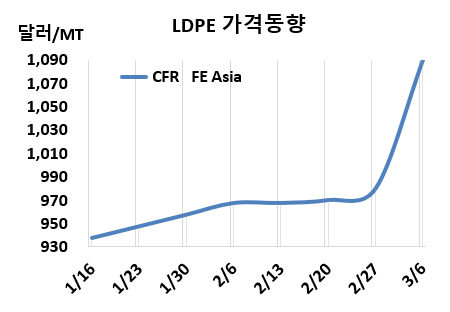 LDPE 시세는 3월4일 CFR FE Asia가 톤당 1090달러, CFR SE Asia는 1165달러로 각각 110달러, CFR India는 1180달러로 100달러 폭등했다. 유럽은 3월6일 FD NWE 1200유로로 50유로 상승했다.