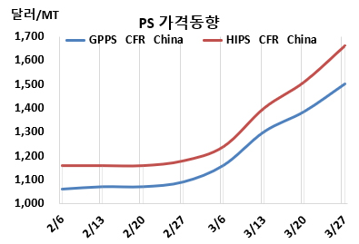 화학뉴스 2026.03.31 PS(Polystyrene)는 상승세를 이어갔다. |