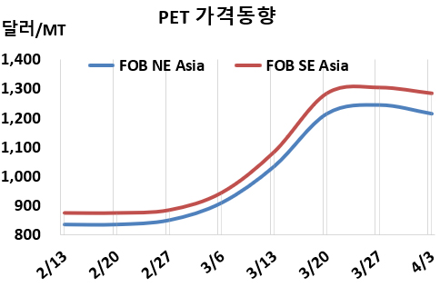 병(Bottle) 그레이드 PET 시세는 4월1일 FOB NE Asia가 1215달러로 30달러, FOB SE Asia는 1285달러로 20달러 하락했다. CFR India는 1310달러로 75달러 떨어졌다. 반면, 유럽은 4월3일 FD NWE가 톤당 1450유로로 50유로 상승했다. 아시아 시장은 7주 만에 하락세로 전환했다.