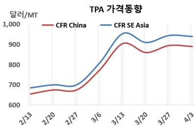 PTA 시세는 4월3일 CFR China가 톤당 890달러, CFR SE Asia는 940달러로 각각 5달러 하락했다. CFR India는 975달러로 변동이 없었다.