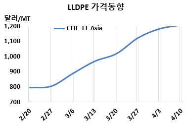 LLDPE 시세는 4월8일 CFR FE Asia가 톤당 1210달러로 25달러 상승한 반면, CFR SE Asia는 1475달러로 변동이 없었다. CFR India는 1550달러로 35달러 올랐다. 유럽은 4월10일 FD NWE 2100유로로 250유로 폭등하며 여전히 초강세를 지속했다.