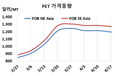 한편, 인디아 릴라이언스(Reliance Industries)는 4월13-19일 모든 PET 그레이드에 대해 가격 보호(Price Protection) 정책을 발표했다.