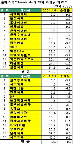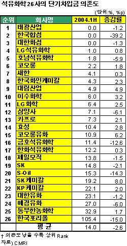 2004년 6월 105.4% 달해 … 석유화학 14.0%에 플래스틱ㆍ고무 17.3% 안정성 지표와 관련된 화학기업의 단기차입금 의존도가 석유화학, 고무ㆍ플래스틱, Chemicals 3개 부문 모두에서 하향세를 보인 가운데 고무ㆍ플래스틱이 평균 17.3%로 가장 높게 나타났다.2004년 상반기 석유화학 26사의 평균 단기차입금 의존도는 14.0%로 한국포리올 105.4%, 동부한농화학 32.9%, 애경유화 27.0%, 대한유화 23.1%, KP케미칼 22.1% 등이 20% 이상의 높은 의존도를 보였다. 단기차입금 의존도가 가장 크게 확대된 석유화학기업은 SK케미칼로 2004년 상반기 19.2%를 기록하며 전년동기대비 8.0%p 높아졌다.