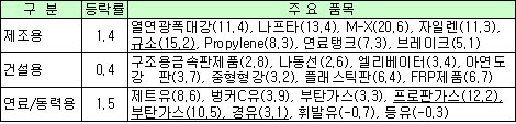 건설용 플래스틱ㆍFRP도 6% 이상 올라 … 물가지수 5개월째 상승세 국제유가 상승과 일부 국제원자재 가격의 상승 여파로 석유화학제품과 금속1차제품의 가격이 크게 오르면서 원재료와 중간재 물가가 상승세를 이어가고 있다.한국은행에 따르면, 2004년 9월 국내 물가지수는 중간재 품목 중 제조용 M-X(Mixed-Xylene) 가격이 20.6% 상승하고 나프타가 13.4%, Propylene이 8.3% 상승한 데 이어 자일렌 수입가격이 11.3%, 연료ㆍ동력용 제트유와 벙커C유가 각각 8.6%와 3.9% 오르면서 전년동기대비 13.3% 상승한 것으로 나타났다. 화학제품 및 석유제품으로는 규소가 15.2% 오르고, 건설용 플래스틱판이 6.4%, FRP(Fiber Reinfored Plastic)제품이 6.7%, 부탄가스가 3.3% 올랐으며, 수입 부탄가스와 경유 가격도 10.5%와 3.1% 상승했다. 이에 따라 전체 물가지수는 114.1(2000년=100)로 2003년 9월과 비교할 때 16.1% 급등한 것으로 집계됐다. 다만, 전월대비로는 0.3% 상승해 8월의 증가율 2.0%보다 상승폭이 다소 둔화됐다. 인플레이션 선행지표의 성격을 띠는 원재료 및 중간재 물가상승률은 2004년 5월 13.5%, 6월 13.2%, 7월 13.8%, 8월 15.3%에 이어 5개월째 연속 고공행진을 계속하고 있다.