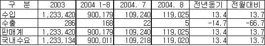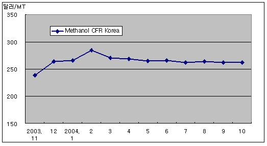 초산ㆍMTBE 제조용 수요증가 따라 … 수출은 14.7% 감소 2004년 1-8월 메탄올(Methanol) 수입량이 9만179톤으로 전년동기대비 13.4% 증가했고 수출은 168톤으로 14.7% 감소한 것으로 나타났다.국내 Methanol시장이 수요증가에 따라 수급타이트 현상을 보이고 있기 때문이다. 메탄올 수요의 43% 가량을 차지하는 초산(Acetic Acid)과 MTBE 수급이 타이트해짐에 따라 원료인 메탄올 수요 또한 증가하고 있다. 특히, MTBE 수요가 지속적으로 증가할 것으로 전망되고 있어 메탄올 수입량은 12월까지 꾸준히 늘어날 것으로 예상된다.