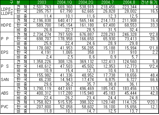 HDPE 중심 시장점유율 상승 … 수익성 향상은 기대 이하 중국의 HDPE(High-Density Polyethylene) 수입량 중 한국산이 32.4% 차지하며 중국 시장점유율을 높여가고 있다.중국의 8월 합성수지 수입은 HDPE, ABS(Acrylonitrile Butadiene Styrene) 등이 전년동월대비 10% 이상 증가한 반면 PVC(Polyvinyl Chloride) 등은 뚜렷한 감소세를 나타냈다. LDPE(LLDPE 포함)의 수입은 1.4% 증가했는데 LDPE 수입이 10.2% 줄어 10만735톤을 기록했지만 LLDPE가 23.4% 증가해 감소분을 만회했다. 그러나 6대 합성수지 중국수출 담당자들은 “수치상으로 나타난 것으로 좋아하기는 어려우며 오히려 측정치들이 빛 좋은 개살구에 그칠 수도 있다”며 우려를 나타냈다. 한국산 합성수지의 중국 수출량은 증가하고 있으나 대부분이 범용 그레이드 위주로 편향돼 있어 수익성은 기대 이하이기 때문이다. 수출 관계자들은 최근 전반적으로 중국 수출가격이 좋아지고 있어 다소 안심이 되고 있지만 언제 상황이 역전될지 모르기 때문에 촉각을 곤두세우고 있다고 밝혔다.