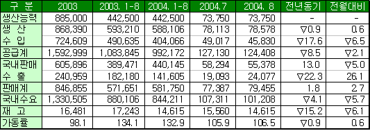 1-8월 생산량 0.9% 줄어 … 현대석유화학은 수출물량을 내수로 전환 1-8월 EG(Ethylene Glycol) 생산량이 전년동기대비 0.9%, 수입은 17.6%, 수출은 22.3% 감소했으나 국내판매는 13.0% 증가한 것으로 나타났다.생산량이 소폭 감소한 것은 호남석유화학이 2004년 4월 1달 동안 No.1 플랜트, 15일 동안 No.2 플랜트의 정기보수를 실시했기 때문이다. 호남석유화학의 No.1 및 No.2 플랜트 생산능력은 각각 12만톤으로 정기보수로 인한 생산량 감소분은 No.1 플랜트 1만톤, No.2 플랜트 5000톤으로 가동률 회복 기간 동안 약간의 손실분을 고려하면 1만5000톤 이상으로 추산된다. 국내판매는 13.0% 증가했으나 수입이 17.6% 감소해 국내수요는 4.1% 줄어든 것으로 나타났고 EG 생산기업 가운데 유일하게 수출하는 현대석유화학이 수출물량을 국내공급으로 전환하면서 수출이 22.3% 감소했다. 수입은 국내 EG 생산량의 약 50%를 차지하는데, 수입이 17.6% 감소한 것은 EG 수요의 90% 이상을 차지하는 화학섬유 경기의 장기불황으로 화학섬유 생산기업들이 가동률을 감축함에 따라 EG 수요가 평균 5-10% 감소했기 때문으로 분석된다. 특히, 대한화섬은 EG 소비량이 50% 감소한 것으로 알려졌다.