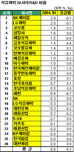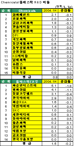 R&D투자, 2004년 상반기에도 부진 … 플래스틱은 1.5% 달해 국내 상장 화학기업의 2004년 상반기 매출액 중 연구개발비 비율은 2003년 상반기에 비해 전반적으로 하향세를 나타내 석유화학 및 Chemicals 평균이 각각 0.8%에 머물렀고 고무ㆍ플래스틱은 1.5%를 기록했다.석유화학 26사 중 R&D비율이 가장 높은 곳은 SK케미칼로 2.9%를 나타냈고 LG화학이 2.0%로 뒤를 이었으며 현대석유화학 분할 인수 및 KP케미칼 인수로 석유화학기업 선두로 부각된 호남석유화학은 R&D비율이 0.5%로 석유화학 26사의 평균치인 0.8%에도 밑돌고 있는 것으로 나타났다. 석유화학기업 중 R&D비율이 1.5%를 웃돌고 있는 곳은 2%대의 SK케미칼과 LG화학을 제외하고 코오롱 1.8%, 삼양사 1.6%, 제일모직 1.5%, 금호석유화학 1.5% 등 4사에 불과해 국내 석유화학기업들이 연구개발 투자에 여전히 적극적이지 않은 것으로 지적된다.