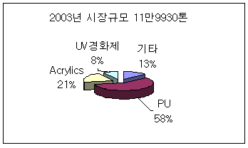 2008년 14만2000톤으로 확대 전망 … 자동차ㆍ휴대폰이 견인차 서유럽 플래스틱 코팅 시장이 2008년까지 14만2000톤 규모로 연평균 약 3.4% 성장할 것으로 예상되고 있다.Information Research에 따르면, 플래스틱 코팅 가운데 PU(Polyurethane)가 전체의 58%를 차지해 최대 시장을 형성하고 있으며 앞으로 Acrylics 시장점유율을 잠식할 것으로 전망됐다. 자동차 부속품 시장은 플래스틱 코팅 최대 소비분야로 서유럽 플래스틱 소비의 42%, 즉 5만1000톤을 차지하고 있다.