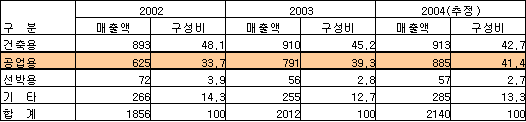 11월2일 시화공장에서 기업설명회 개최 … 2004년 매출의 41.4% 차지 삼화페인트(대표 김장연)가 앞으로 공업용 및 특수 기능성 도료 사업에 집중하며 기업혁신을 꾀할 방침이다.삼화페인트는 11월2일 시화공장에서 개최한 기업설명회를 통해 중장기 성장 전략으로 공업용 도료의 전략적 판로를 개척하고 특수기능성 도료를 개발하는 한편, 해외 수출시장을 공략하는 등 향후 사업계획을 제시했다. 특히, 삼화페인트는 공업용 도료 중 UPE 도료, 제관용 도료, 공업용 우레탄도료, PCM도료에 대한 판로를 넓힘과 동시에 차열도료, 소취도료, PCM 잉크 사업, Polyurea 및 PU Foam 등 고기능성 특수도료의 신규 시장 개척에 주력하게 될 것이라고 밝혔다. 삼화페인트는 2002년 이후 공업용 도료 매출비중이 점차 확대됐는데 2002년 33.7%에서 2004년 41.4%에 달할 것으로 전망돼 건축용 도료(42.7%)와 거의 비슷한 수준으로 확대됐다. 삼화페인트의 2004년 1-9월 매출액은 1610억원으로 전년동기대비 10.8% 증가했는데, 건축용 도료가 1.9% 증가한 반면 공업용 도료는 17.1%로 큰 폭의 증가율을 나타냈다. 공업용 도료 비중이 커지게 된 것은 일반공업용 도료 및 플래스틱 도료의 판매 증가와 체육시설용 우레탄도료, 보경로용 포장재 등의 판로가 확대됐고, 원가상승에 따른 도료 판매단가 인상이 주 요인으로 해석된다.