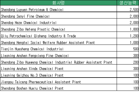 중국, 수요 5000톤에 공급 3000톤 … 고무촉진제ㆍ의약용 수요 호조 중국에서 고무산업이 급성장하면서 2-Aminodimethylpropane 또는 Trimethylaminometane으로도 불리는 tert-Butylamine와 관련한 분야가 성장의 원동력이 되고 있다.중국은 초기에 tert-Butylamine를 주로 Rifampicin 합성원료로 사용했기 때문에 대부분의 생산기업들이 몇 백톤 또는 몇 십톤에 불과한 생산능력을 보유하고 있었다. 래디알 타이어(Radial Tire) 생산능력은 최근 지속적으로 확대되고 있으며 국제시장에서는 발암성 추진제인 NOBS(Noxydiethylene-2-Benzothiazole Sulfonamide) 사용이 금지되고 있다. 이에 따라 중국 tert-Butylamine 시장도 급성장하고 있다. 중국 내수 생산기업의 상당수가 1000톤 가량의 생산능력을 보유하고 있는데, 20사 이상의 메이저 생산기업의 전체 생산능력은 1만톤 이상에 달하나 실제 생산량은 약 4000톤에 불과하다. 중국의 tert-Butylamine 수요는 최근 지속적으로 증가하고 있어 생산량으로는 수요를 충족시키기 어렵기 때문에 수입으로 부족분을 충당하고 있다. 특히, 고무경화 촉진제 NS(N-tert-Butyl-2-Benzothiazyl Sulfonamide) 분야가 급성장함에 따라 tert-Butylamine 수요전망은 더욱 밝은 것으로 평가되고 있다. 또 몇몇 기존 NS 생산기업들이 생산능력 확대 및 플랜트 건설을 계획하고 있어 앞으로 중국의 tert-Butylamine 수요는 급증세를 유지할 것으로 전망된다. tert-Butylamine는 다양한 의약품 중간체로 사용되는데, 주로 3-Formyl-tert-Butylamine Rifamycin을 합성하는데 이용되고 있다. 3-Formyl-tert-Butylamine Rifamycin은 결핵 치료제인 Rifampicin의 중간체이다. 중국에는 60사 이상의 Rifampicin 생산기업이 있으며 생산량 및 판매량 모두 높은 수준으로 매년 대량으로 수출하고 있다. 따라서 Rifampicin은 중국의 tert-Butylamine 주요 소비분야 가운데 하나이다.