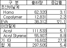 또 2003년 12월부터 2004년 6월까지 7개월 연속 플러스 신장을 유지했고 6월 출하량은 7.8% 증가한 5만800톤으로 3월 10.1% 증가에 이어 높은 신장률을 나타냈다. 일본 에멀젼공업협회는 2004년 수요가 전년대비 0.7% 증가해 59만톤에 달할 것으로 예측했으나 상반기 출하실적으로 볼 때 실질출하는 예측치를 웃돌 가능성이 크게 나타나고 있다. <화학저널 2004/11/19> |