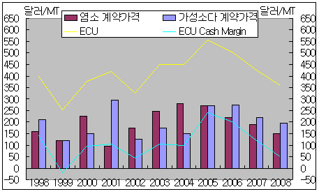 그러나 PVC(Polyvinyl Chloride)와 PU(Polyurethane) 수요가 하반기에는 계절적 요인에 의해 감소하는 경향이 있으므로 염소 수요는 상반기보다는 약간 둔화될 가능성이 제기되고 있다. 가을철에는 북부지역 지면이 빨리 얼어 건설공사 시기가 주로 상반기에 집중되고 겨울에는 재고 저장비용도 높아져 수요기업들이 재고량을 줄이기 때문이다. 미국 CA 생산기업들은 수요가 공급을 추월하고 있고 앞으로 2-3년간 신규 생산능력 창출계획이 없기 때문에 염소는 2004년 하반기에도 최고가격을 유지해 나갈 것으로 보고 있으며, 가성소다 가격은 2005년 중반까지 분기마다 추가적 상승세를 나타낼 것으로 전망하고 있다. 표, 그래프: | 미국 CA 가격전망 | <화학저널 2004/12/01> |
