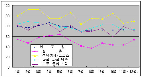 한국은행, 12월 BSI 73으로 정체 … 고무ㆍ플래스틱은 크게 하락 제조업 체감경기가 좀처럼 호전될 기미를 보이지 않고 있는 가운데 원화환율 급락으로 수출기업 채산성이 급격히 악화되고 있는 것으로 조사됐다.한국은행이 2456개 국내기업을 대상으로 조사한 <11월 기업경기조사 결과>에 따르면, 12월의 제조업 채산성 실사지수(BSI)는 74로 11월보다 2p 하락했다. 특히, 수출기업의 채산성 BSI는 10월 76에서 11월 69로 급락함으로써 1999년 1.4분기 68 이후 최저치를 기록했다. 채산성 BSI가 100을 밑돌면 채산성이 악화됐다고 느끼는 기업의 수가 그렇지 않다고 느끼는 기업보다 많음을 뜻한다. 원화환율 급락의 영향으로 수출증가율 전망 BSI도 11월 105에서 12월 96으로 급락해 2004년 들어 처음으로 수출증가율 전망지수가 100 밑으로 떨어졌다. 경영 애로사항으로는 내수부진이 29.7%로 11월에 이어 가장 큰 비중을 차지했으며, 다음으로 원자재가격 상승이 20.7%, 불확실한 경제상황이 14.9%를 차지했다. 10월 경영 애로사항 설문조사 때 응답비율이 1.4%에 불과했던 환율문제는 12월 조사에서 8.5%로 급상승해 최근의 환율급락이 기업들에게 큰 부담을 주고 있음을 나타냈다. 11월 제조업의 업황BSI는 73으로 10월(72)과 비슷한 수준에 머물렀으며 12월의 업황전망BSI는 73으로 11월(74) 수준보다 떨어져 경기부진이 계속될 것임을 예고했다. 화학제품 관련업종은 화학제품이 11월 73에서 12월에도 73으로 변동이 없었으나 고무ㆍ플래스틱은 79에서 71로 급락했다. 섬유는 11월 43에서 12월 53으로 급상승했으나 여전히 부진을 면치 못할 것으로 전망됐다.