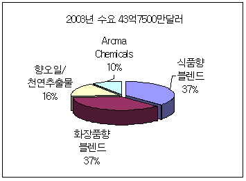 IFF(International Flavors & Fragrances)는 2004년 7월 과일향 조제(Fruit Preparation) 사업을 Frutarom Industries에 매각하기로 결정했으며, 투자기업 Nautic Partners는 6월 LBO(Leveraged Buyout)을 통해 Jordan으로부터 FFG(Flavor & Fragrance Group)을 인수하기 위해 2개 향료기업과 컨소시엄을 결성했다. 또 식품향(Flavor) 합성 시장은 2007년 약 16억달러로 연평균 3.6% 성장하고 화장품 향료(Fragrance) 시장은 16억달러로 연평균 4.1% 성장할 것으로 전망되고 있다. 향 오일(Essential Oil) 및 천연 추출성분 수요는 7억달러로 연평균 4% 증가하고 아로마 화학성분 수요는 4억5500만달러에 달해 연평균 0.9% 증가할 것으로 예상된다. Givaudan은 2004년 상반기 순이익이 2억2000만SF(1억7610만달러)로 32% 증가했으며 매출은 14억SF로 1.5% 증가했는데, 과자류, 유제품 및 조미식품 수요강세가 식품향 매출신장에 기여했으며 고급 향수에 사용되는 성분 수요강세 역시 화장품 향료 매출을 끌어올리는데 일조했다. IFF 역시 2004년 1-월 순이익이 1억1790만달러(구조조정 부과금 제외)로 16% 증가했으며 매출은 10억6000만달러로 12% 증가했다. 2/4분기 순이익은 5650만달러로 10%, 매출은 5억2420만달러로 9% 증가한 것으로 나타났다. 표, 그래프: | 미국의 향료 수요비중 | <화학저널 2004/12/07> |