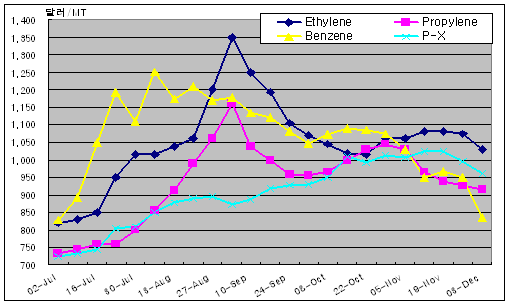 에틸렌(Ethylene) 역시 가격하락을 예상해 구매가 중단된 상태이며 P-X(Para-Xylene)도 유가가 떨어지고 폴리에스터(Polyester) 수요가 약세로 반전되면서 가장 큰 구매처인 타이완이 지난주부터 톤당 970달러에서 거래를 중단시켜 하락세가 지속되고 있다.