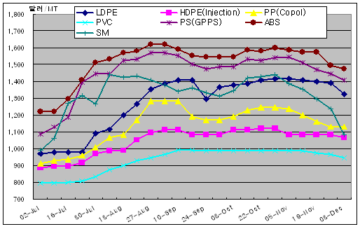 시장 관계자는 “국제유가도 유가이지만 벤젠(Benzene), SM(Styrene Monomer) 등 상승폭이 컸던 석유화학제품을 중심으로 거래가 전혀 이루어지지 않고 있어 추가적인 가격하락이 예상된다”며 상황을 전했다.
