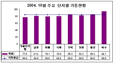 30개 국가단지 84.6%로 9월보다 0.7%p 상승 … 석유화학 호조 영향 국가산업단지의 10월 공장가동률이 2달 연속 상승하며 2004년 들어 가장 높을 수준을 나타냈다.한국산업단지공단(이사장 김칠두)이 전국 30개 산업단지를 대상으로 조사한 자료에 따르면, 10월 공장가동률은 84.6%로 9월보다는 0.7%p, 2003년 10월보다는 0.6%p 상승했다. 산업단지공단은 내수 부진 및 고유가, 원화환율 하락에도 불구하고 수출호조세에 힘입어 높은 가동률을 기록했다고 분석했다.