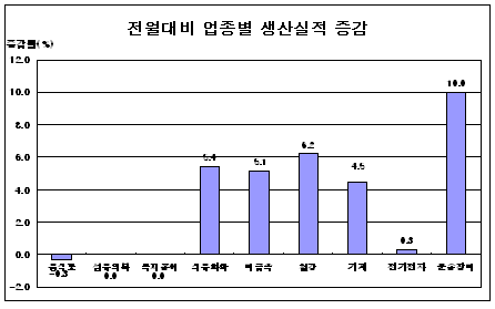 석유화학은 세계경기의 회복과 최근 고유가에 따른 수출단가 상승으로 큰 폭의 수출 증가세를 기록했는데, 울산단지는 중국의 경제성장, 본격적인 성수기 진입에 따른 수요증가로 전월대비 14.3% 증가했다. 이밖에 자동차, 선박도 해외 마케팅 노력 강화 등으로 양호한 수출실적을 기록했다. 표, 그래프: | 2004.10월 주요 단지별 가동현황 | 전월대비 업종별 생산실적 증감 | <화학저널 2004/12/10> |