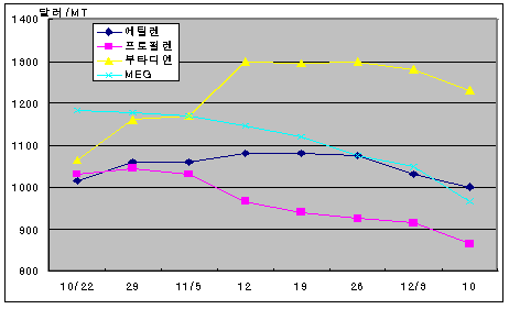 부타디엔(Butadiene) 역시 11월12일 및 26일 FOB Korea 1300달러로 초유의 강세를 나타냈으나 12월10일 1230달러로 50달러 폭락했고, EG(Ethylene Glycol) 역시 CFR Korea 965달러로 전주에 비해 무려 83달러 폭락했다.