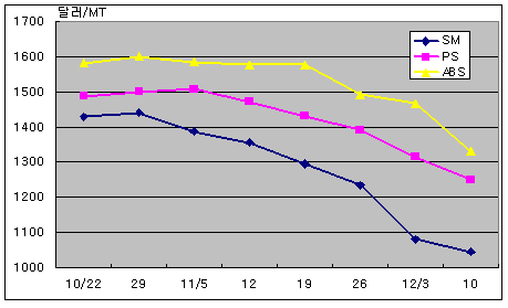 기초유분 가격 동시폭락 … PSㆍABS는 100달러 이상 떨어져 아시아 석유화학 시장이 11월까지 계속 상종가를 유지했으나 국제유가가 하락세로 전환된 후 폭락현상을 지속하고 있다.아시아 시세는 중국의 국경절 연휴가 끝난 이후 원유 및 나프타(Naphtha) 가격이 일시 하락했음에도 불구하고 수급타이트에 강세를 지속했으나 12월 들어 국제유가가 하락세를 지속하면서 2주 연속 폭락했다. 에틸렌(Ethylene) 가격은 12월3일 FOB Korea 톤당 1031달러로 44달러 급락한데 이어 12월10일 또다시 1000달러로 31달러 급락했다.