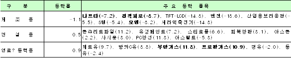 최종재물가의 전년동월대비 상승률은 8월 4.9%에 이어 9월 4.1%, 10월 2.2% 등으로 계속 둔화추세를 보이고 있다. 한국은행은 “환율 하락세와 함께 국제유가가 비교적 안정추세를 보이고 있어 당분간은 원재료ㆍ중간재와 최종재 물가 상승세가 진정될 것으로 보인다”고 주장했다. 표, 그래프: | 가공물가 변화(2004.11) | <화학저널 2004/12/17> |