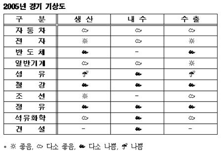 조선은 수주 및 수출시점의 시차 때문에 환차손이 발생할 것으로 보이며, 특히 섬유업종은 2004년 말 WTO(세계무역기구) 협정에 의한 미국, 유럽 등의 섬유쿼터제도 폐지라는 악재와 함께 주요 경쟁국인 중국이 고정환율제를 고수하고 있어 어려움이 가중될 것으로 전망된다. 표, 그래프: | 2005년 경기 기상도 | <화학저널 2004/12/17> |