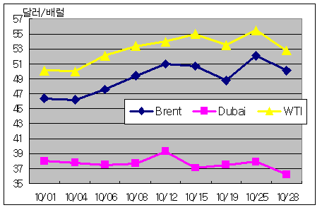 10월 중순 사상 최고가 갱신 … Dubai유 40달러, Brent유 50달러 육박 2003년 미국-이라크 전쟁 완료 후 안정세를 찾아가던 국제유가가 2003년 하반기에도 소폭의 등락을 거듭하더니 2004년 10월에는 미국 서부텍사스중질유(WTI) 현물가격이 사상 처음으로 배럴당 55달러를 돌파했다.국내 주요 수입원유인 중동산 Dubai유도 배럴당 40달러에 거래됐으며 북해산 Brent유는 배럴당 50달러 이상을 기록했다. 전문가들은 이와 같은 국제유가 폭등에 대해 “수요, 공급, 심리적 요인, 투기세력, 테러위협 등 생각할 수 있는 모든 요인이 한꺼번에 겹쳐 일어나면서 빚어진 결과”라고 분석했다. 2004년 초 난방 수요 증가로 상승세를 타기 시작해 석유수출국기구(OPEC)의 감산 및 이행결정에 이어 이라크의 정정불안과 중국을 비롯한 선진국 중심의 세계 경기 회복에 따른 수요 증가로 세계적인 휘발유 수급불안 우려감까지 겹쳤기 때문인 것으로 해석된다.